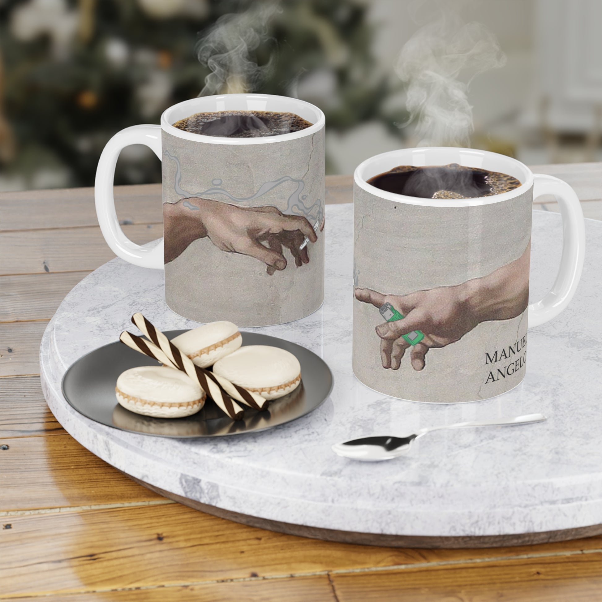 Inspirada en la icónica creación divina, pero con un toque “¿ya te tomaste el café o solo estás existiendo en automático?”, esta pieza es perfecta para regalar, provocar conversación o simplemente recordar que hasta en el paraíso necesitamos una taza de café (y probablemente algo más fuerte también).